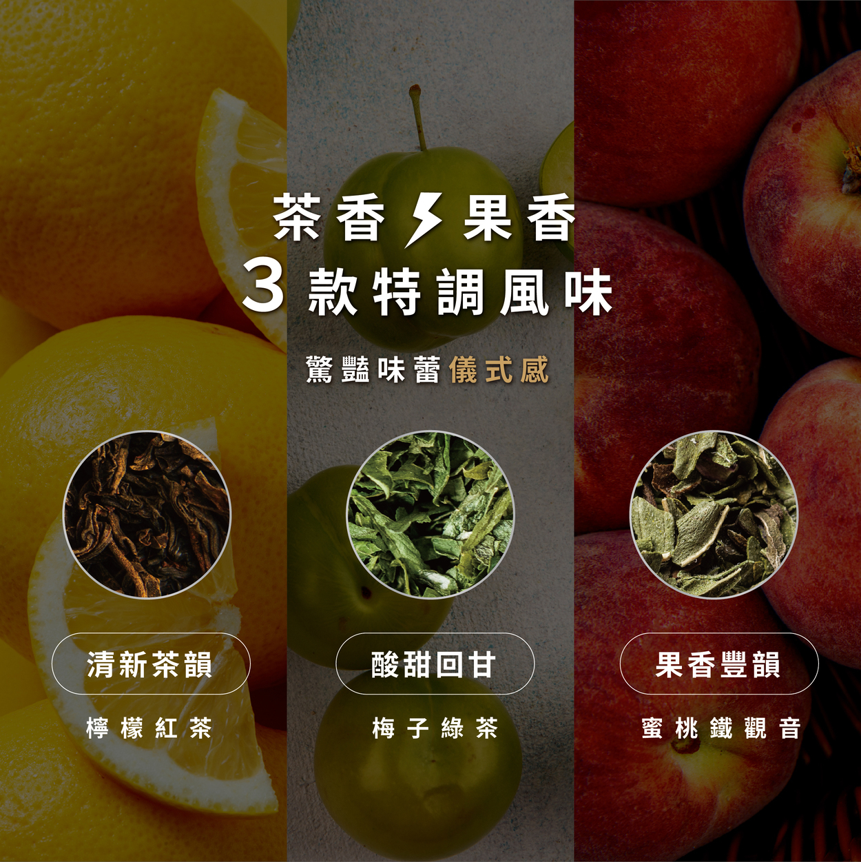Three special flavors, including refreshing lemon ice tea, sweet and sour plum green tea, and fruity peach tieguanyin.